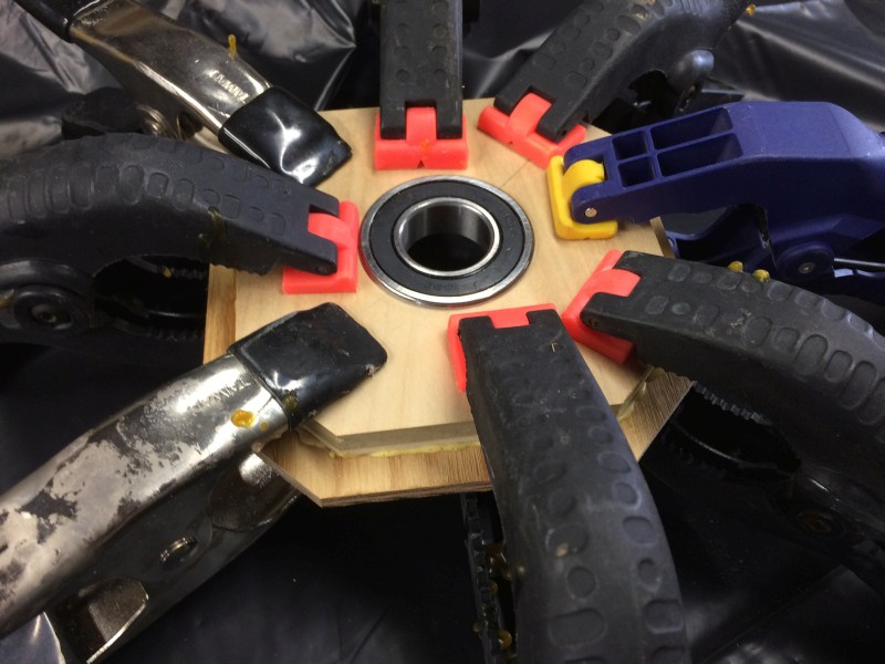 I carefully put glue on the flange, keeping the glue to a minimum and keeping the glue away from the bearing. The last thing you want to do to a beautiful brand new bearing is get glue in it. So I do the best I can centering the flange on the hole in the wheel and I clamp it down to dry. It won’t be perfect. It will be slightly off center, but that’s OK. We will fix that later. Attachment 55829 And here is the other flange getting glued to the spacer so it will be ready for the other side of the wheel when we get to that point. Attachment 55830 And here we see that no glue got in the bearing. Good. Also, these are some clamps I made to use when building my kayak. You take a PVC pipe, and cut one inch segments off of it. Then you cut a kerf into the offcut. You can pull it open, and it wants to spring closed. It has about as much force as a spring clamp, and when you need 30 spring clamps, it’s a lot cheaper to buy a pipe and make them than to go out and buy that many clamps. They are very handy. Attachment 55831 |