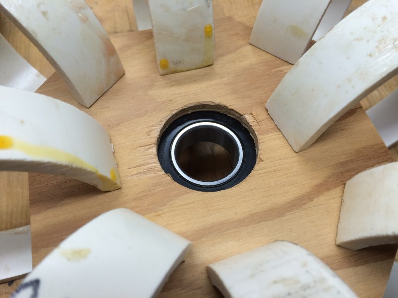 I'm going to spin them on their shafts and turn them down to size with a chisel, just like on a lathe, and then balance them by putting them on little roller blade ball bearings on a screwdriver, and just remove wood as needed with a forstner bit until they are balanced. They will look a little ugly with holes drilled in them, but they will work well.