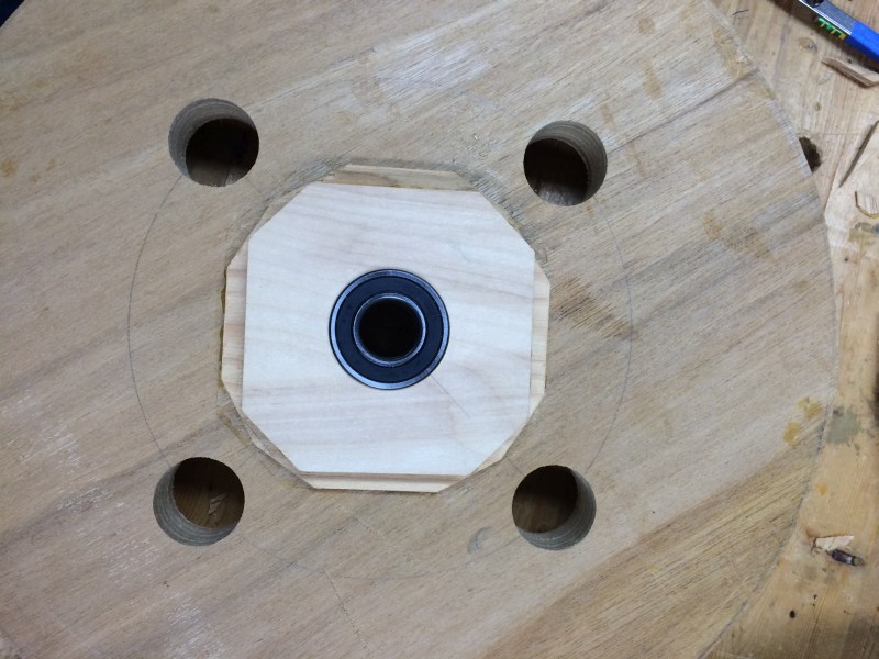 I drilled a hole in the center, ¼ inch wider than the shaft is. There will be an eighth of an inch between the shaft and the wheel on each side. Attachment 55822 Each wheel has flanges that are glued to it, and there are spacers to push the flanges out to the sides a little and make the wheels really steady. I cut the flanges to size and drilled holes in them to accept the shaft and bearings. Attachment 55823 The bearings are pressed in to the wooden flanges and just held there by friction. I used a 2 inch forstner bit to cut the hole for the 2 inch outer diameter bearing. The bearing can be easily pushed through the hole with my fingers. It’s a nice fit once you line it up, but it just slides right through the hole. Attachment 55824 |