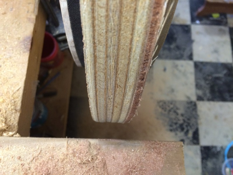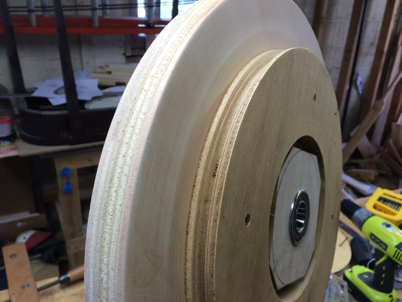 It’s a Wednesday, but in an unprecedented move, the DC Metro system decided to give me a day off. Thanks, guys! I’m getting better at the amount of glue I use. I’m still deliberately using too much, but at least it’s not ridiculous any more. Here, I’m working on what will be the other wheel. I used layers of quarter inch birch plywood for this one. I don’t remember where this plywood came from, but it’s cleaner looking. I think I was more careful with the glue this time so I could keep the pretty wood pretty. Attachment 55818 Saturday 3/19/16 I double checked the plans, and my wheel blanks aren’t thick enough. So I glue another quarter inch of plywood to each one. Attachment 55819 Thursday 3/24/16 It’s spring break, and I’m back from college tours with the family. I use a handheld saber saw to cut a rough wheel for the bandsaw. I cut it slightly oversized so I can fine tune it later on its axis. Attachment 55820 There’s sawdust blocking the view, but check out that edge. Gluing these thin sheets of plywood really resulted in a nice end product. These wheels will be nice. Attachment 55821 |