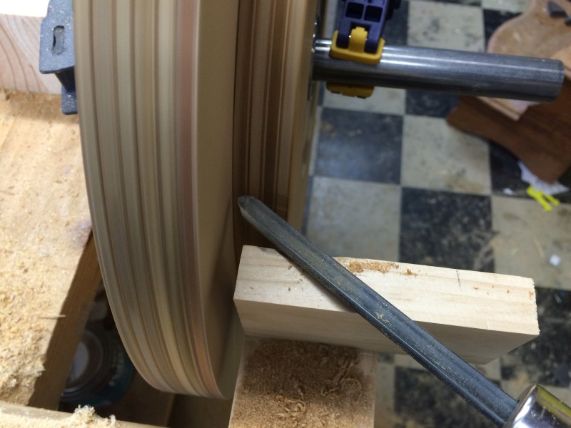 Last night I reconfigured the way I had the steel shaft clamped down. I removed the sloppiness that was there before, so the bar isn't swaying 1/8th of an inch back and forth with each turn of the wheel. It's rock solid now. I turned the wheels a little bit more, but was very tentative because I didn't know how much material to take off. I knew the wheels were a little oversized, but during glue up, the plywood panels had shifted around slightly, and it was possible some spots on the edge didn't have much material left for me to remove. So I looked up what the finished diameter was supposed to be, and I measured the circumference with my wife's cloth tape measure, and see I have about 2 inches of circumference or so to remove, and around a quarter inch of radius to remove. So I can be less tentative about this and really make some sawdust. The size of the wheel doesn't have to be exact, but the two wheels do need to match one another pretty much exactly or the band saw blade will not be plumb. Working for 20 minutes or so during random evenings after work, you don't make much progress. Hopefully I'll get some real work done this weekend. |