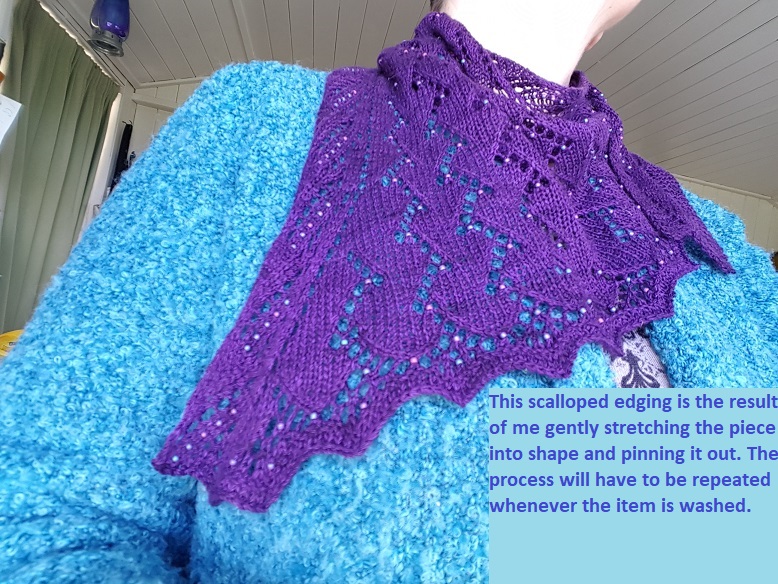 It involves soaking the item for around 20 minutes in warm water. Extremes of temperature can cause felting, as can too much agitation of the item in the water; twenty minutes is time enough for water to soak right through to the core of the yarn. You can see here that the yarn "bled" a little. This often happens with artisan dyed yarn. Attachment 63664 Then you wrap the sodden object in a towel and squish as much water as you can out of it. The aim is to have it just damp, all the way through. This means you can stretch the item out and pin it into the shape you want. I took pic of this stage but accidentally deleted it, I'm afraid. The blocking process, as well as setting the shape of the piece, evens up the stitches a treat! The reason your grandma's knitting looks so neat and even is because of the numerous times it's been washed. All that gentle shoogling of the stitches evens out the wonky tension between them. The result: Attachment 63668 I'm a happy bunny. Thank you BigV! x Attachment 63666 |