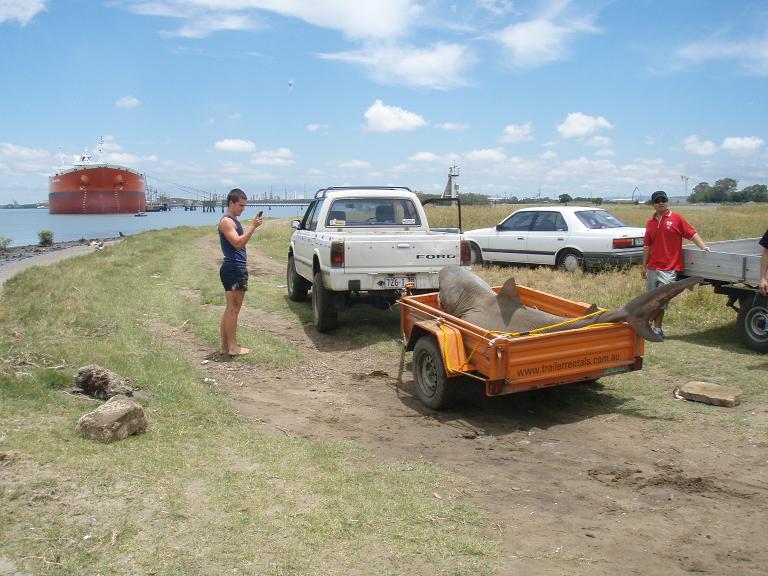 Classic, it was caught at the mouth of the Brisbane River. There's no surf there. The Brisbane River opens onto Moreton Bay which is protected by large sand islands. People catch shark to eat. Plenty of people make a living from it in fact. Not all species are protected, and Bull sharks definitely are not. I suspect they probably sold that one to one of the local seafood shops, although I can't be certain of that. No doubt they'll keep the head and clean up the jaws as a trophy though. As a matter of interest, it is now understood that numbers of sharks along the coast of Australia have been under estimated to the point that some sharks previously listed as endangered or protected perhaps need not be. More research is currently being undertaken on that particular subject though. |
