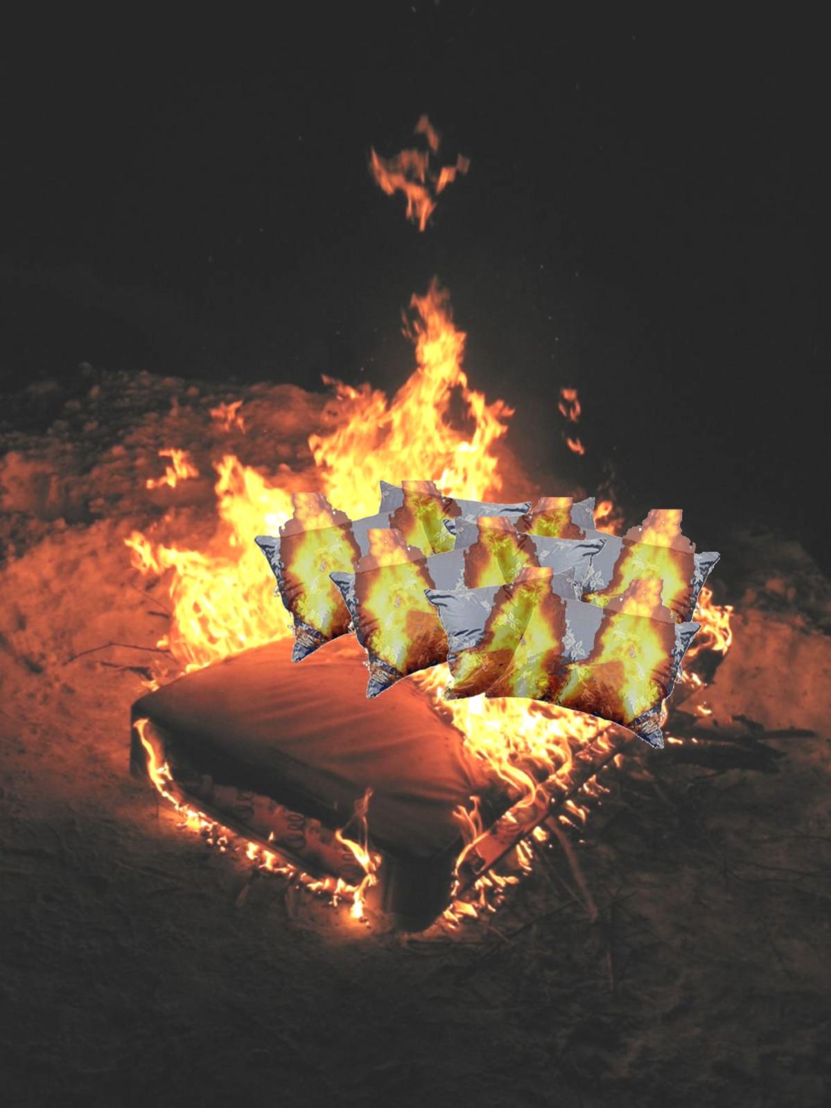 It's been quite some time since I last visited this site. I have a new picture that I have photoshopped using a similar program to Photoshop. Again, the picture shows the destruction of bedding by fire. I found a picture of a bonfire in a forist campground firepit. I added in several pillows. Set fire to the pillows (OK -- Photoshopped the flames and char marks). Then I assembled the pictures to produce a fairly reasonable facsimile of burning pillows. The flames have differing levels of transparency / opacity. Also, I was using only two basic flames that I repeated with different orientations (reflections). |