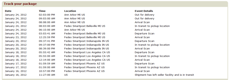 Wasn't life much less stressful when we couldn't track the progress of our packages? My new keyboard appears to have boomerang and tardis tendancies, arriving in Ann Arbor before it left Belleville and out for delivery twice yesterday but still not delivered!