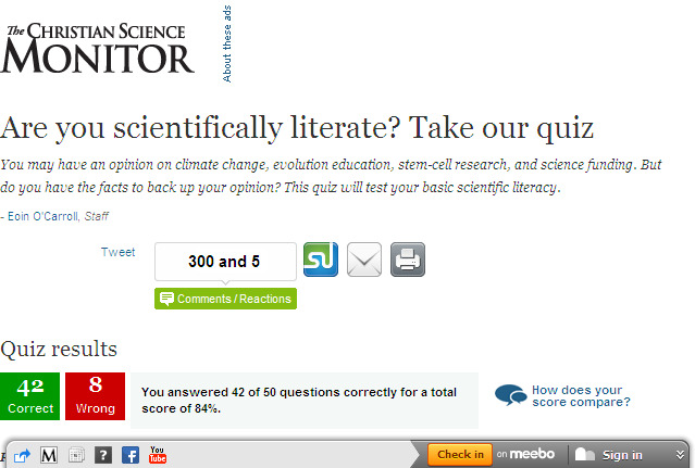 I took it, my score and my shame are posted below. I could have answered two of the eight I missed correctly, but I moved too quickly. Oops. Well, I deserve the score I got. Be aware, it's kind of a long test, fifty questions. I took about ten minutes to complete it. It covers physics, biology, history, chemistry, astronomy, mathematics, geometry, etc. I really liked it, I hope you like it too. Are you scientifically literate? |
