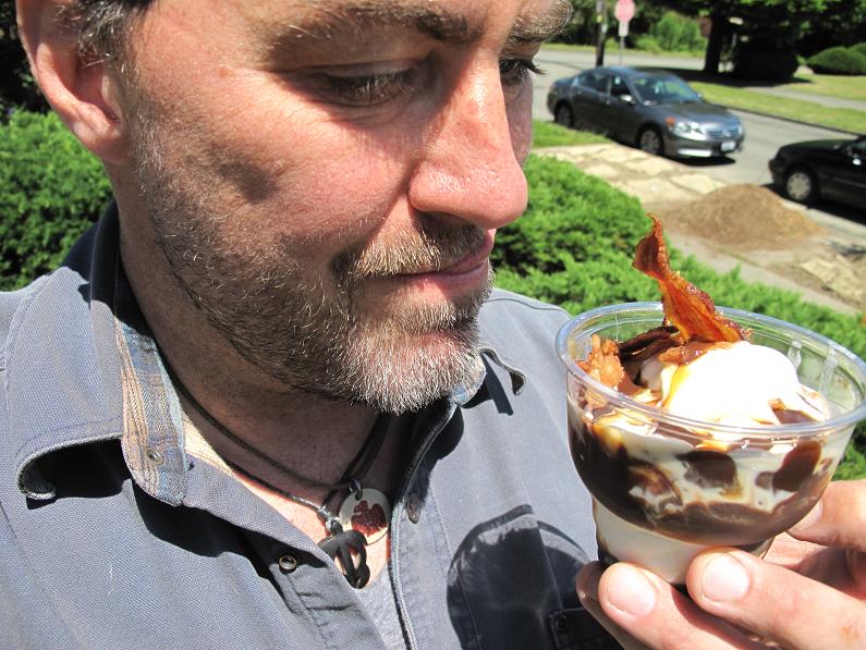 It isn't, as I thought bacony ice cream. It's a vanilla icecream with fudge, caramel etc and there are some crumbly bits of bacon sprinkled on top. I'd imagine the little hit of salt amidst the sweet would really work. |