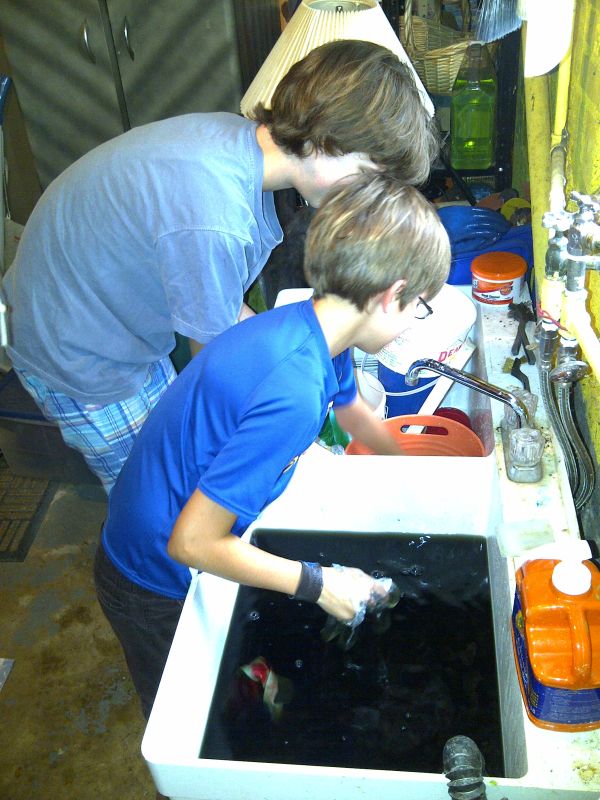 Let them rest over night and then in the morning, we rinsed them out in the utility sink before throwing them in the washing machine. That sink full of water looks like ink.