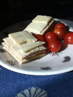 Six crackers and cheese, plus tomatoes. The tomatoes are tiny, about an inch in diameter. A word about cheese .... I like it a lot, too, and once upon a time this sort of this was a late night snack for me. Now I try to make it a meal, usually lunch, and add some fruit/veg. |