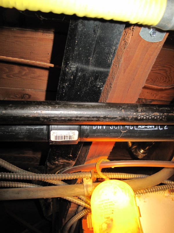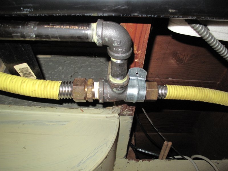 Attachment 40916 This is the wall behind the space where the stove/oven lives. As you can see, the old electric stove 220V outlet is there, as well as a register for the furnace. This particular duct is amputated and non-functional. Conspicuous by its absence is a gas line. Not for long! Attachment 40917 Welcome to my basement, please overlook the mess. The yellow line is my gas line. The yellow line is CSST, corrugated stainless steel, a flexible (slightly so, a bend radius of approximately 18 inches. Not exactly supple, except when compared to black iron pipe.) On the left is a 1 inch line, then a iron tee/reducer 1"-3/4", then off to the right is a 3/4" line that runs all the way to the dryer. This line runs parallel to the wall you saw in the previous picture and somewhat "behind it". Attachment 40918 Here I've rotated 180 degrees and am looking up at the bottom of the floor shown in the first picture. On the left you see a gray curved conduit, that's the conduit that carries teh 220V electrical for the stove. a little to the right is the underside of the furnace duct/register. You can see the amputation at the upper right of this picture. Also prominent in this picture and the previous one is the black pvc pipe. That is my kitchen sink/dishwasher drain. I installed this new run a few years ago (a different DIY story). The spiral half-inch conduit is armored conduit for my electical runs. Inside those conduits are cloth covered electrical circuits. The white painted valve and the copper lines are the remnants of the relocation of the electric water heater and its replacement with a gas fired unit. Attachment 40919 Are you oriented now? The tee points in the direction parallel to the joists, and is located a couple of feet to the left of the previous camera position and slightly behind it. |