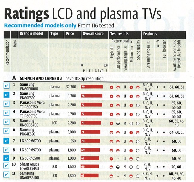 V -- We have a 46" Samsung in the living room. We got it a few years ago, so the model is not listed in glatt's reports but I think it's the older sister to the 6500 you're planning on getting. The display is beautiful enough that we actually get compliments on the great picture when friends come over. I think you'll enjoy your two new sets immensely!