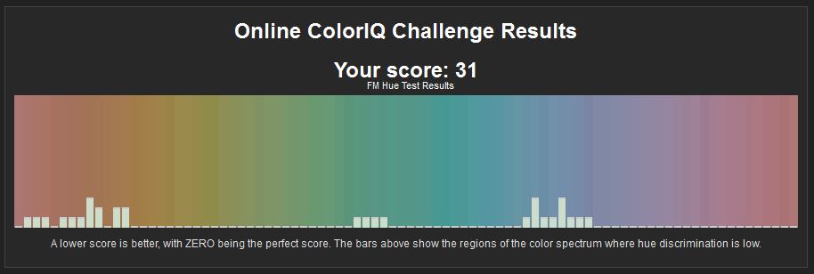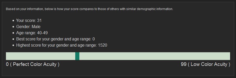 I got a 15 on the color test, which was better than I was expecting. But I would think surely the quality of your computer monitor would affect the outcome?