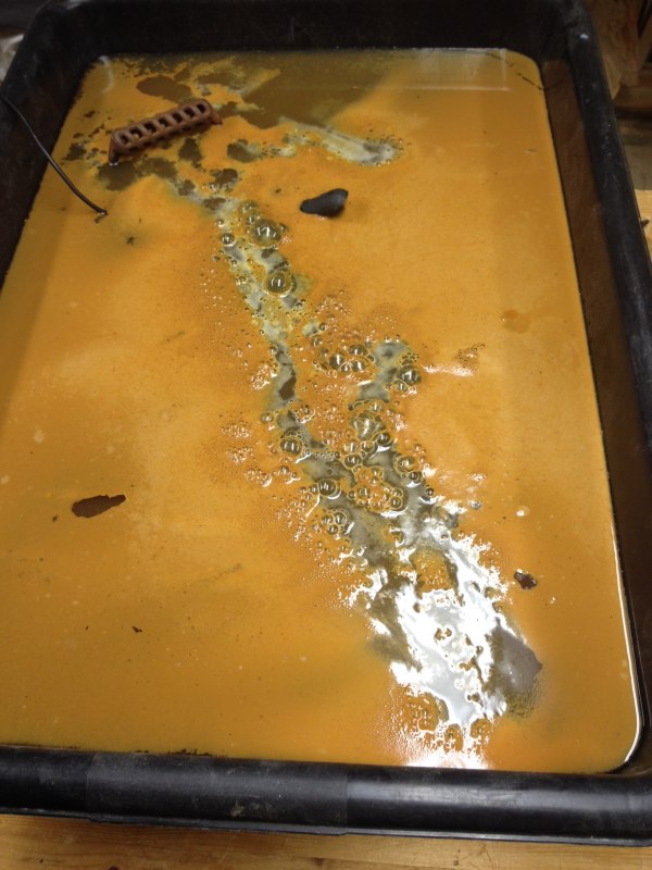 The cookie sheet was in a big plastic pan, and I covered that with three strips of wood, because for the electrolysis to work, the tool can't touch the sacrificial metal, otherwise the electric current will just go metal to metal instead of through the solution. I poured five gallons of water over the tool, and added 5 tablespoons of baking soda to act as an electrolyte. Most instructions on the web say to use washing soda, but baking soda works just as well and is something I had on hand. I had clamped the negative wire to the tool so there was a good electrical connection. When I plugged the laptop charger in. the water started looking a little cloudy around the tool near the wire. Attachment 48172 After a couple minutes bubbles started appearing. After 30 minutes there was a rusty scum forming on top. Attachment 48173 And after a couple hours, the rusty scum was really thick. Now you probably remember from your high school chemistry that water is made of oxygen and hydrogen, and when you run electricity through water, it splits the hydrogen and oxygen apart. So a byproduct of this process is flammable gas bubbles surrounded by pure oxygen bubbles. Sounds scary to me. Many sites say to only do this stuff outside. But I tried setting the bubbles on fire with a match, and they wouldn't burn. I fired up a propane torch and held the flame against the bubbles and instead of a big fire ball like I was expecting, there was only a little sputtering. So I think it's safe to do this in the house for a couple hours at a time. I wouldn’t leave it for days and walk away, but a few hours is fine. It's definitely flammable though. Attachment 48174 |