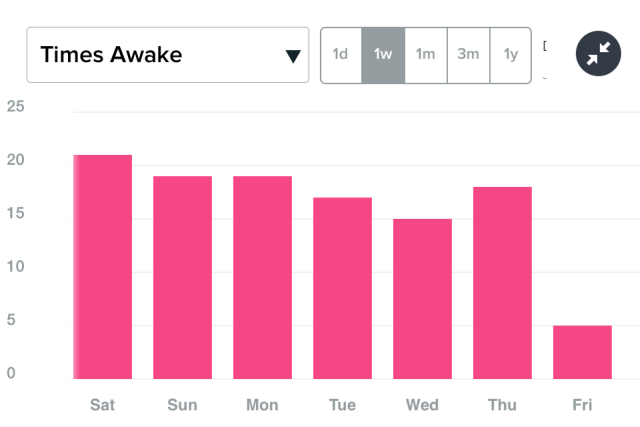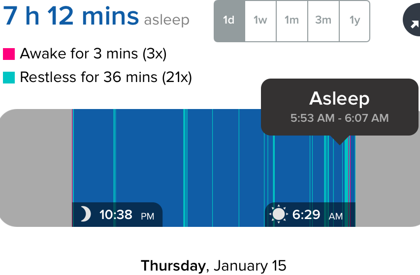 It's a digital watch that also tracks your steps, your sleep, your elevation gain, acts as a silent vibrating alarm clock on your wrist, and gives caller id for your cell phone. The most interesting thing to me is the sleep tracking feature. I've always felt like I slept poorly. I fall asleep easily but feel like I toss and turn all night. I'm constantly waking up, rolling over, and falling back asleep. Sometime my pillow case comes clean off by morning time because I'm moving around so much. Now I have a couple weeks of data that confirm this feeling. These are screenshots off my phone, which is bluetooth synched to my watch. Total hours of sleep each night for a week. This actually looks pretty good. Could be much worse. Attachment 50113 But when we look at how many time I wake up during the night or am restless, the picture becomes a little more grim. Attachment 50112 Friday actually looks not so bad, but I gave the device to my wife to wear, so I could see what another person looks like as they sleep. |