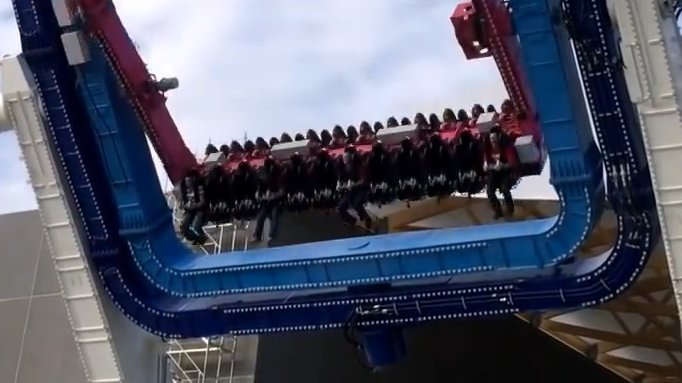 Looks like the dangly feet are just barely missing that beam as it swings past each time. Looks like a double foot amputation just waiting to happen. If I designed the thing, I'm have more like 3 feet of clearance instead of maybe 1 foot that exists here.