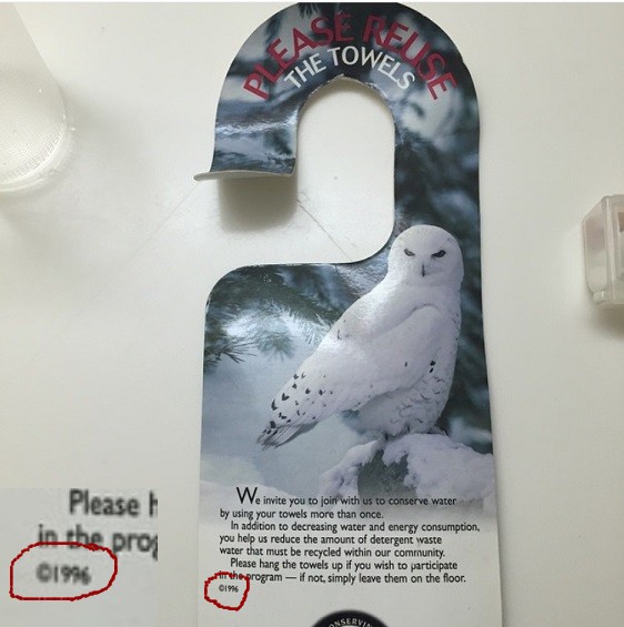 This was in a hotel I stayed in in Cheyenne, WY earlier this year. I interpreted it as, "Every time you waste a towel, God kills a snowy owl."