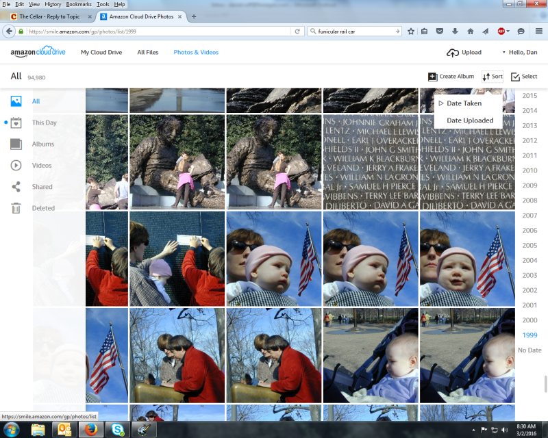 Amazon unlimited cloud came free for a year with the purchase of a wifi router a few months ago. So I backed up all my 100,000 photos onto their servers. I don't like the interface with the pictures. I'd prefer a windows style folder system, but they have them organized into different folders according to when they were taken or when they were uploaded. You can choose. So the folder organization I had them in when I uploaded them was lost, and now it's just a big jumble of tens of thousands of pictures in Chronological order.