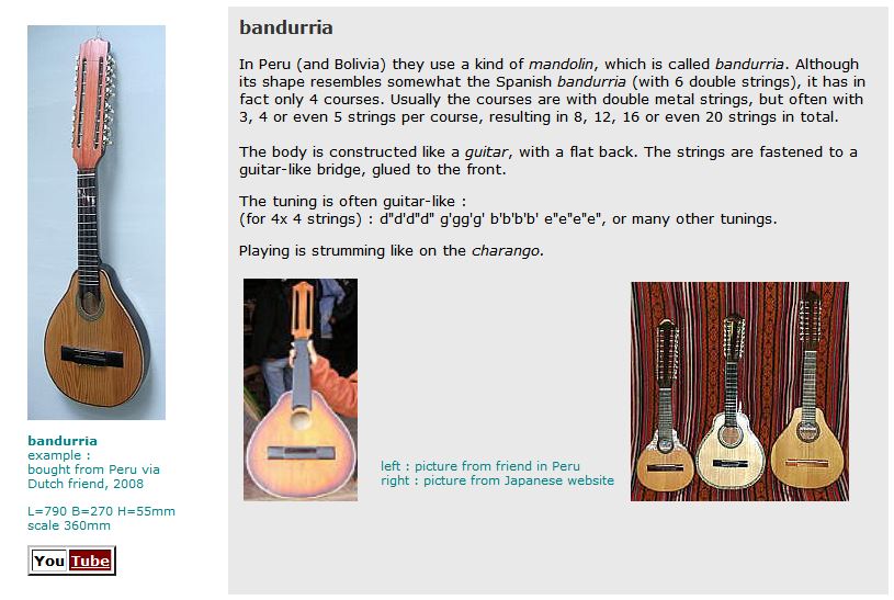 Oh Christ, I went to read about the Bandurria and there were two more. :facepalm: BANDOLA - Some bandolas have 12 strings (in 6 double courses, like the Spanish bandurria), but most of the Colombian bandolas have 16 strings, with the 4 top courses triple. Note that in the Philippines exists a similar looking bandurria with 14 strings. The tuning is like a Spanish bandurria in 5-5-5-5-5 (frets) : f#f# bb e'e'e' a'a'a' d''d''d'' g''g''g''. BANDOLIN - The bandolin from Ecuador has a body shaped much like a bandola or mandolin, but it has 5 courses of triple metal strings, in a guitar-tuning. The bandolin is made like a guitar, with a flat back. The fingerboard is slightly raised above the front, and has metal frets. The long flat tuning head has 7 tuning machines on the right side and 8 tuning machines on the left side of the open pegbox. The 15 metal strings (in triple unison courses, with only the two lowest ones with a low octave string in the middle) run over a loose bridge to a metal stringholder on the end of the body. This makes it different from the bandurria from Peru, which has a similar body shape, but with the strings fixed to a guitar-like bridge. The tuning is guitar-like : e"e'e" a"a'a" d"d"d" fis" fis" fis" b"b"b". South America sure has a shitload of different instruments, lot of pluckers down there. |