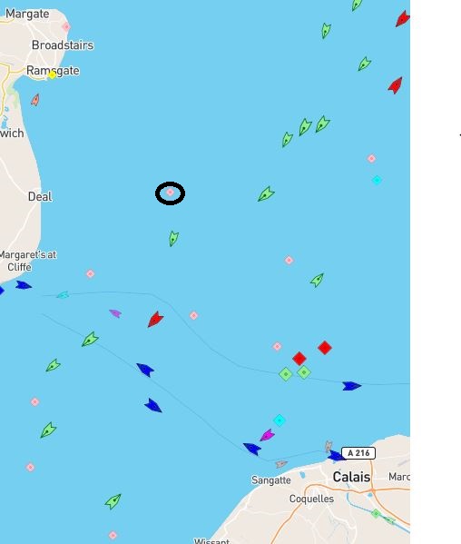 A screen grab of shipping in the English Channel this afternoon in the vicinity of the Goodwin Sands with the East Goodwin light vessel circled. There's a managed traffic system through the Straits of Dover with SW bound traffic on the English side and NE bound on the French side. What complicates matters is the constant to and fro of the cross channel ferries marked in dark blue on the map. See www.marinetraffic.com One man survived the capsizing of the South Goodwin light vessel (referenced above) but no trace was ever found of the six remaining crew members. Quote: