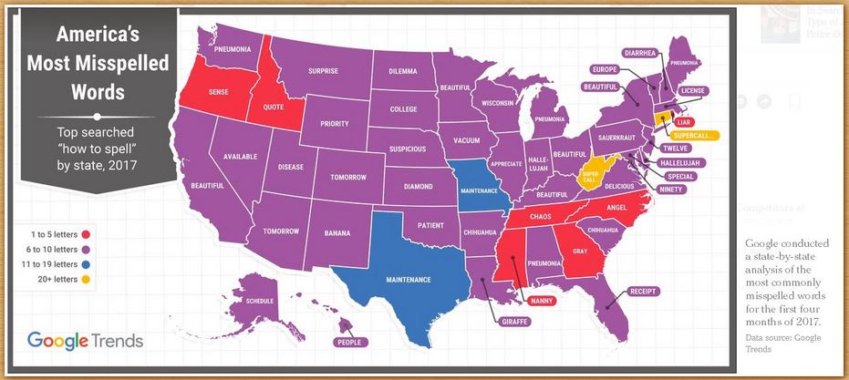 I can't spell worth a damn - only these new fangled programs that I have on my iphone and windows 10 save me from complete and utter demoralization, so I was fascinated to come across a compendium from Google Trends which gives the word the most residents of each state sought to spell in the first four months of this year. In my own home state of New Mexico that word was "banana." Yeah, never could spell that. Bannana? Bananna? Bandana? Pendejo! But why were New Mexicans so interested in correctly spelling "banana" when Pennsylvanians were eagerly looking up "sauerkraut," Californians were thinking about "tomorrow" and Rhode Island(?) was trying to figure out "deceit"? Interesting that last one. :eyebrow: