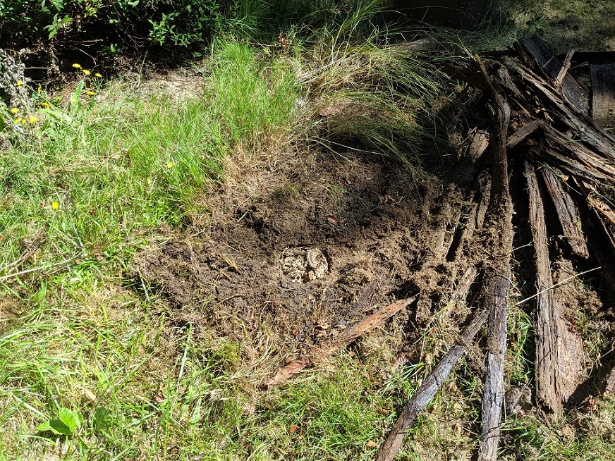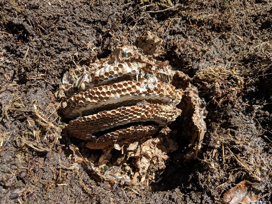 I cleared the area very neatly as I wanted make sure I had a clear understanding of the scope of the problem. In this wider shot you can see I've uncovered the top of the nest. The whole thing was about the size of a large cantaloupe. Attachment 68328 When I went to try to pry it out intact, I wound up tipping the axis of the core with the four horizontal disks of hive inside the paper skin. This was unintentional, but very revealing. There are (barely still) living yellowjackets in this shot, having spent a second can of chemical warfare, but they're subdued. Attachment 68329 So I took the opportunity to kick'em while they were down. What? I'm not paying me to bring these bombs back home! This final strike made a very wet soggy mess of the whole/hole affair. Attachment 68330 Plus, as you can see here in the distance, I'd staged more cans of poison along my escape route should I need to beat a hasty retreat. Hopefully I wouldn't trip on the rake on my way out. |
