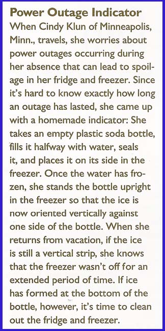 Attachment 68478 Someone told me his wife freezes a cup of water and places a penny on top. That is better because you can tell if the power has been off and if you've been burgled. :rolleyes: |