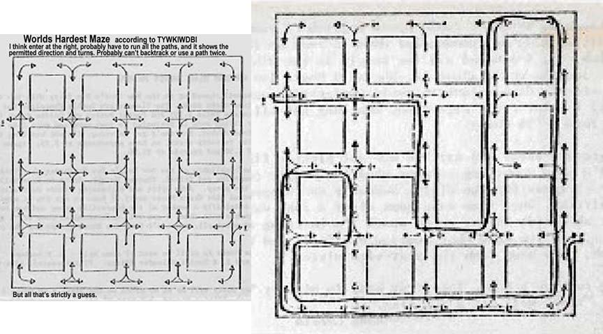 I found the solution to that first maze but didn't find the rules. Most of my guesses were wrong. From the solution I gather you don't have to travel every path, and you can cover the same path more than once. What I don't understand is why they went the way they did when you could enter on the right, drop down, over two, up three, hang a left and on till morning... I mean out. :confused: