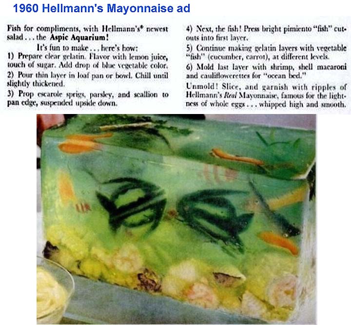 Seems like anything that ain't meat&taters gets shoved into the salad category. One of the salads people have strong opinions on are Jello salads, more properly Aspic salads. I remember Julia Childs saying if your food is pretty someone has had their hands all over it. I'd add complicated. Attachment 71073 It's a Hellmanns ad but I like Miracle Whip better, I think it has more chemicals than mayo. |