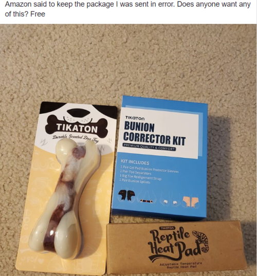 Someone in my 'hood received an Amazon package erroneously. Amazon told them to keep it. They don't want it so posted a pic on Facebook for neighbors to share the bounty.