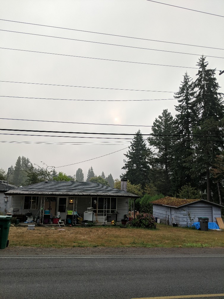 Still quite smoky and foggy here. This is from about 9 am this morning. The sun is that bright ish spot among the power lines.