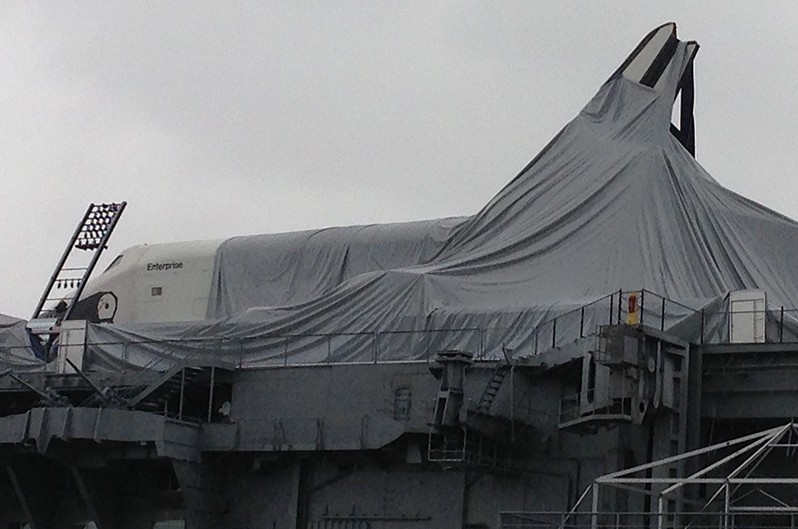 I wasn't clear where they put the shuttle. The Concorde is on a barge tied to the pier. The aircraft carrier is tied to the pier. I thought when I wrote that last year that the plan was to put the the shuttle on the pier, but it looks like you may be right. It may be on the deck of the carrier tied to the pier, covered with a deflatable bubble.