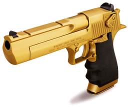 This would have to be the correct semi-automatic accessory for Pimpin' Coat: .50 AE Desert Eagle, with the super-elite, Super-Fly polished titanium gold finish! |
