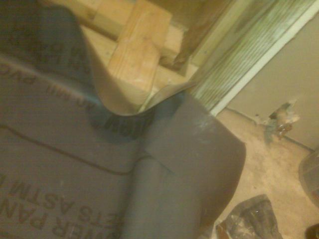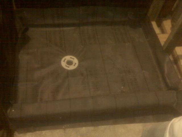we hit a dead end tonight. the ring that goes around the drain is the wrong size. BUT we did get the rubber pan in. first we laid it out then tucked in the corners then located and punched through the drain bolts then put the flange on and tightened it down. after that it was cut to fit but make sure you don;t cut less than 3 inches from the floor. any folds that need to be made can be hidden by the drywall.