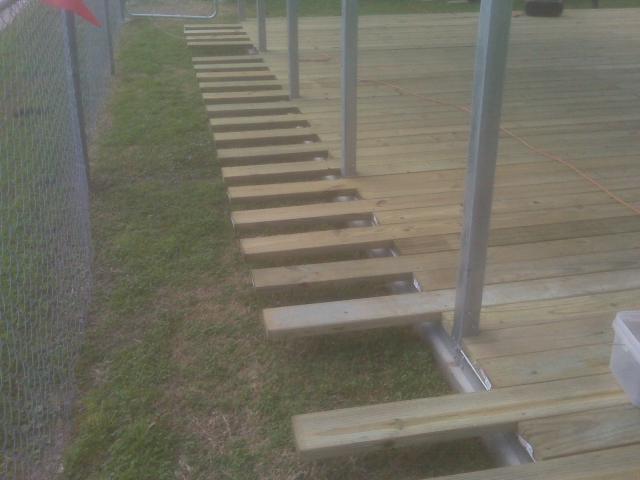 then while he was doing that i was finishing up the deck installation at work. to space the 2x6x10 and 12;s i used nails and put them between them to give room for weather. the boards will expand and contract in hot and cold weather respectively so you want a little wiggle room. then for the boards that were slightly warped i stuck a crowbar in the ground and leaned on it while drilling in the decking screws. after the decking was complete i ran a chalk line down the sides and trimmed off the excess with a circular saw.