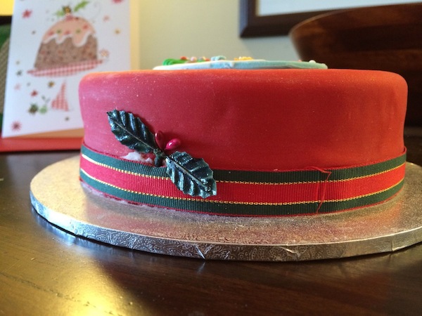 I returned to M'town today and found my Secret Santa gift waiting! I am the very lucky recipient of one of Aliantha's gorgeously decorated fruitcakes!! This cake is a work of art. I took a couple of extra photos to show some of the detail. It looks too pretty to eat but I had to taste it, and it's delicious. Fresh, lots of fruit, and yummy rum or brandy all through ... Ali, you're an artist. Thank you!