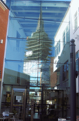 The Cathedral spire reflected in the windows of the BBC buidling opposite.