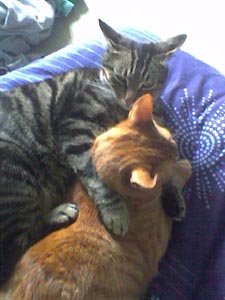 Cute cat overload since I was last here! Limey - come the summer, come the visitor. You can't keep me away now - a mackerel tabby AND a ginger! Glorious. I adore thus. Ah Jinx. Your photography and your Dennis. How could it not be a match? PLEASE come here. And stretch out on my Mum's immaculate floor and take pictures of Diz. I'd save for weeks & weeks & weeks & weeks so that I could treat you to meals out in country pubs. Just to have you photo my boy. Oh and 'cos I'd die to meet you (and the fambly of course!) And I wouldn't even try to shag LJ. Because the 'rents would be involved in driving y'all round... and would object. Oh and of course I have more respect for you than that. And he'd say no and break my heart. Jester & Pie - how cute? So curly and so long!? Kisses needed. Oh, this is the Diz cat, all surprised because I yanked off the duvet.