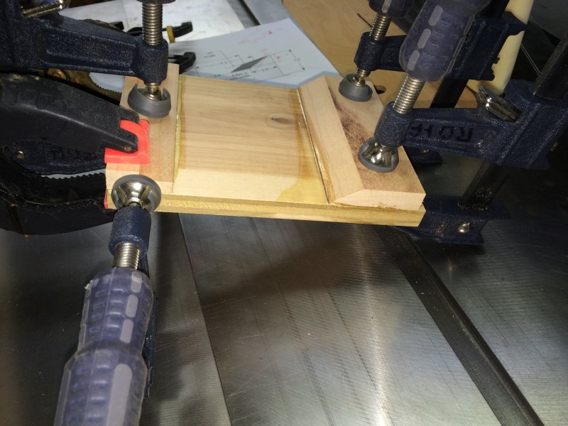 I wanted to tackle this one part again. Attachment 57190 Last time I worked on this, I had machined this part out of solid maple. It wound up being too small because I had built my frame thicker than the plans called for. So I need to adjust the plans. This time, I don't have enough large pieces of maple this size, so I'm going to use plywood for the backing and make a couple smaller parts to glue to the plywood. I annotate the originals plans with measurements to account for the actual thickness, and draw out the little pieces I'm going to make. Attachment 57191 Turns out I'm directional challenged or something, because I cut the 35 degree bevel on the post on the wrong side even after eyeballing everything a half dozen times. I can flip it around and still use it, but that messes up the dimensions a little. So I had to modify the plans for the clamping block again to compensate for that mistake. I think it won't really matter, but I may wind up trying to make these particular parts a third time. Ugh. Attachment 57192 Here they are clamped up to dry. Attachment 57193 |