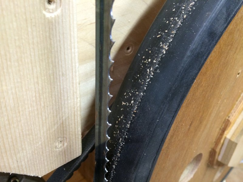 If the wheels are co-planar, free of twist, and properly tensioned the blade will track w/o bearing or guides. Not to say you don't need them but the blade isn't riding on them. Your belt is vibrating, that will add noise and may make the saw vibrate, making cutting less pleasurable and possibly less accurate. Try tightening it. What sort of table will you make? You inspired me to get my bandsaw tuned up. It's run like shit ever since I got it ten years ago. I got out Duginske's book and went over the whole thing. Turned out my wheels were not in the same vertical plane, were twisted, the tires were crap, and the stand was flexing. I got the wheels squared away, put new urethane tires on it, replaced the so-called thrust bearings and replaced the metal block with cool blocks, bolted the metal stand to a plywood base with wheels and replaced the belt with a power twist belt I had laying around. It runs great now, so thanks for the inspiration! I'm looking forward to the table being installed. |