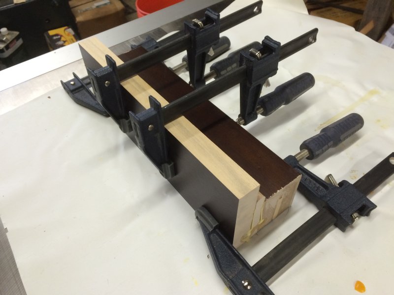 4 Attachment(s) I put blue tape over the end of the t-nut I plan to use because it needs to be free of glue, made sure it was in the correct spot, and then glued the scraps together. Attachment 57576 Here they are clamped together. Attachment 57577 And this is the drawing I am trying to copy. See how that t-nut is in teh exact spot it should be? Attachment 57578 Here, I've cut the block up to match the needed shape. Attachment 57579 |