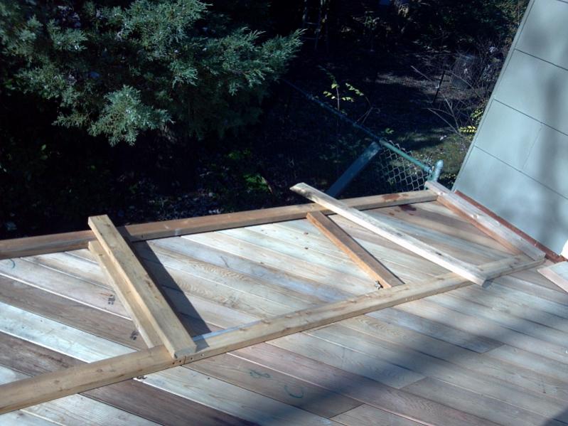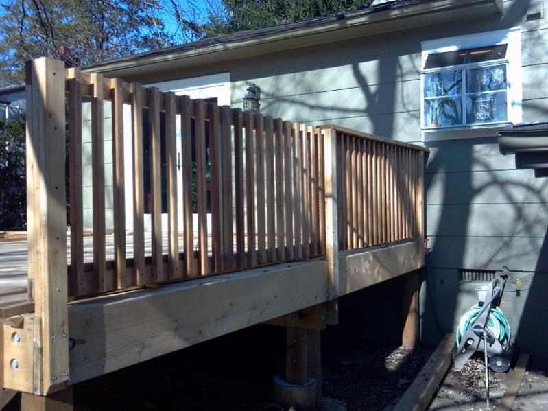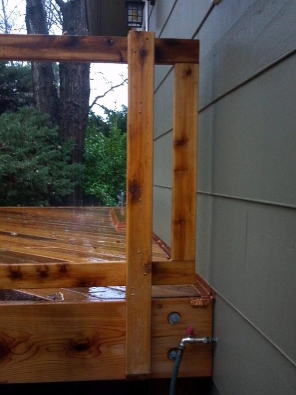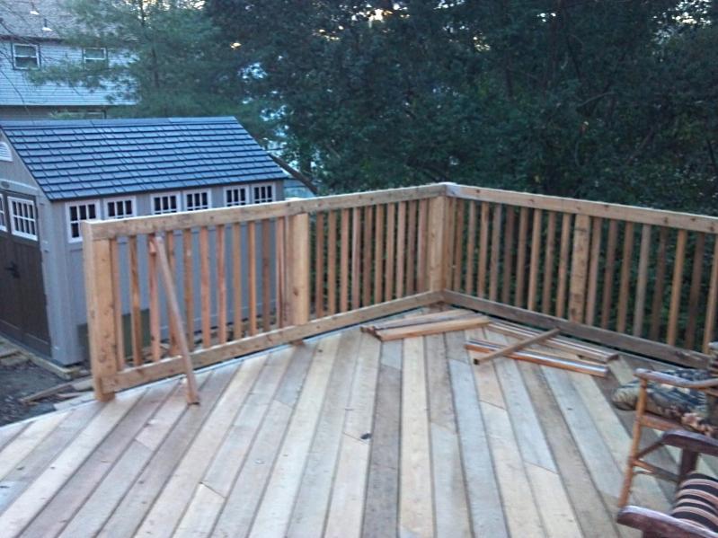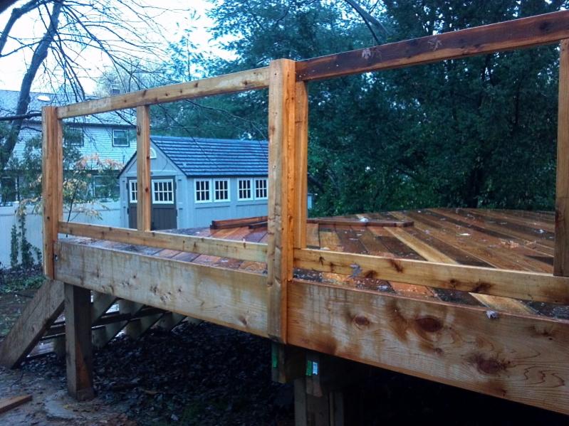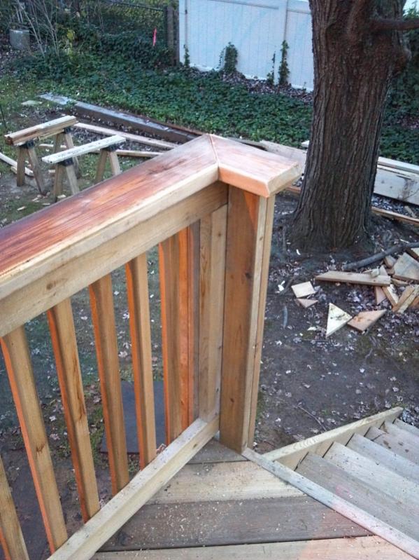 then I top the railing with 2x6 clear cedar. I drill up through the 2x4x8 that was the inside of the box i mentioned in the previous post. I go up about 2 inches into it with a large bit that the head of the screw will fit into. then i tap it the rest of the way, and put a 3" screw into the railing from underneath.