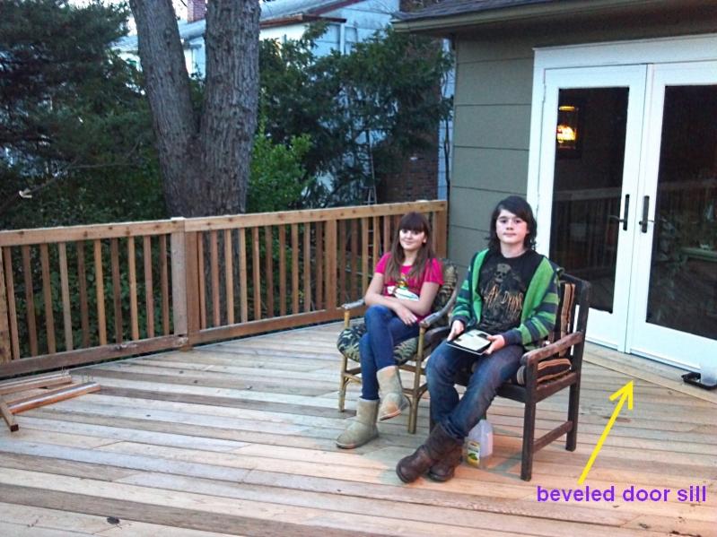 You can see the door sill i did in the back there. I used a 2x12 that we had left over, and beveled it on a 45 around 3 edges. I screwed up from underneath to secure it there. Fits perfectly under the door sill. I love it when a plan comes together. |