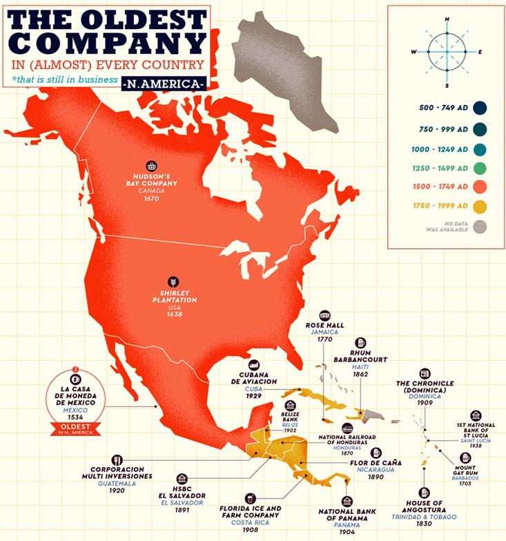 There are maps of each region, and a map of the world showing, the oldest business in each country that has continuously operated and when it started.