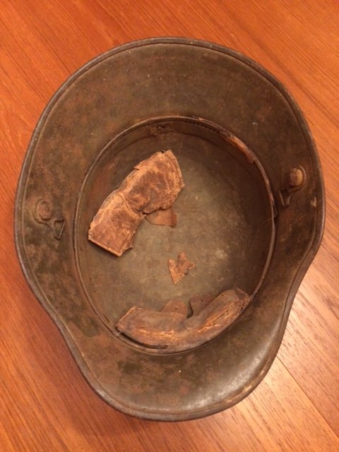 Mostly, I'm thinking of it in these terms so that I realize I don't have any feeling of attachment to it. I loved my grandfather, and I have a lot of his old tools and THOSE really mean something to me. I'd never sell them. I think of him every time I use them. But this thing doesn't connect me to him at all. It's more about my great grandfather, and he didn't even fight in the war, so it's just some thing he collected after the fact. And since nobody alive today ever met him, I have no feelings for him. He sounds like a bit of a jerk though, if he didn't like my grandfather simply for having German parents. Here are some pictures. The remaining leather liner is very brittle, so I didn't turn the helmet right side up for any of these, because the remaining liner would probably break off and fall out. Here's the inside. Attachment 51998 And this is a detail that shows the metal liner band, meaning it's at least a M17 date wise. And the chin strap hardware looks like hardware that I've only seen in pictures of German helmets. There should be a maker's stamp here, but I can't see one. Either it's really faint, or it's non-existent. If it's non-existant, I think that means it's an Austro-Hungarian helmet, but they have different chin strap hardware in every picture I've seen, so I think it's German. Attachment 51999 This detail shot shows "66" stamped in the liner head band. That's the size in cm, and is a little on the large side, but was fairly common. Attachment 52000 And here's a side shot. That "frankenstein" lug on the side only appeared on WWI helmets, so this is definitely a WWI M17 or later helmet. Probably German. Attachment 52001 This one, on eBay, is almost identical. It just sold for $232 here in the US market. It has no trace of liner, and mine has a little bit of leather liner left. But mine is missing one liner pin, and the visor has a slight bend to it. |