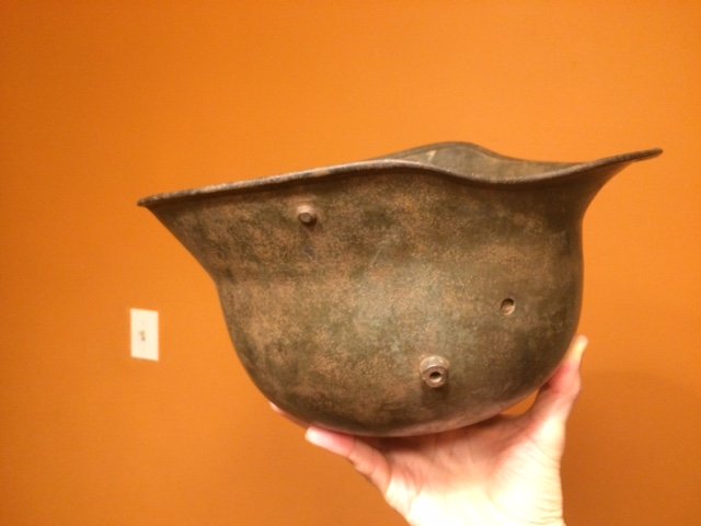 So I took it and occasionally would wear it (in my room,) but it mostly stayed in my old trunk. So recently I've been looking for stuff that is small and valuable and has no real sentimental value to sell on eBay. I remembered this helmet, and pulled it out of the trunk for the first time in about a decade or so. The leather liner, which was brittle but complete in the 80's is now partially fallen apart, and about a third of it is missing. I must have thrown a piece away when I was wearing it one time. I started to try to research the helmet because I know nothing about them, and I discovered that lots of countries used this style of helmet, and they go for between $30 and $1000 on eBay. After a fair amount of internet reading, I have figured out that it isn't a WW2 helmet. It's a WWI helmet, and it looks like it's German, but it doesn't have a manufacturer's stamp. I'd say it's a size 66 M17 WWI German helmet. And my mom is in town right now, so I was talking to her about it, and the timeline for it being a WWI helmet makes sense. My great grandfather hated the Germans. So much, that he didn't want my grandfather, who was of recent German descent, to marry his daughter. So they waited for the old guy to die before they got married. So this helmet was my great grandfather's trophy against the Germans he hated. It's a symbol of family dysfunction as well as being a ghoulish trophy taken off a dead soldier in some trench somewhere. So it's got bad juju. And I think it's good for me to get it out of the house. So now I just want to try to figure out what it's worth so I can hold an appropriate auction. It's all completely original, so I think that works in my favor. It still has a fair amount of paint, with tiny rust specks poking through all over the place and a nice patina. It has the steel liner band and a partial leather liner, which is kinda amazing considering it's almost 100 years old. I wish I knew more about its wartime history, because that seems to jack the price up. But it was brought into the family shortly after WWI. In the 20's or 30's. |