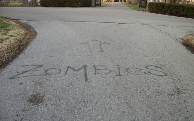 If you go straight through this intersection, you're in the cemetery. Zombies...indeed.