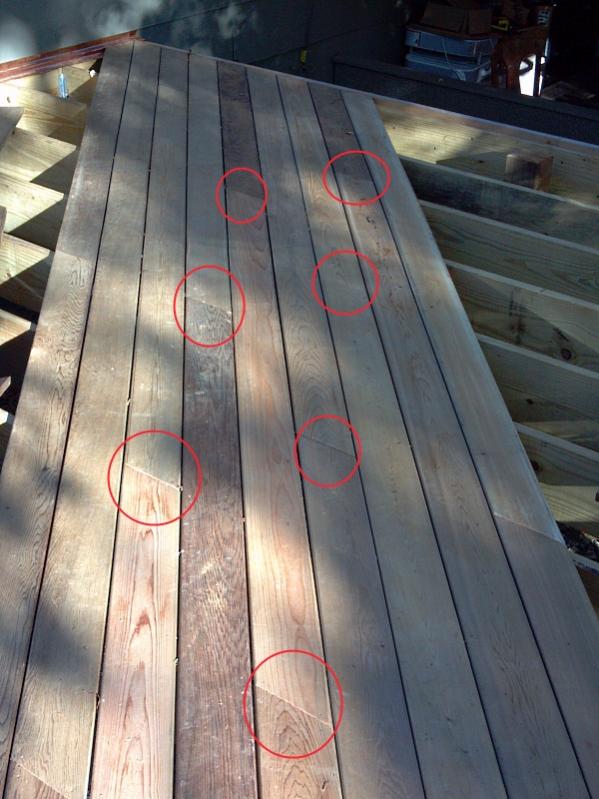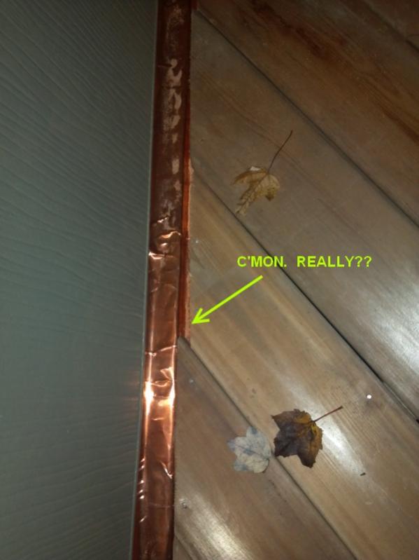There are several spots where the boards are not flush with the edge.... this is the worst...probably because the flashing leaps out at you and glints in the porch light...