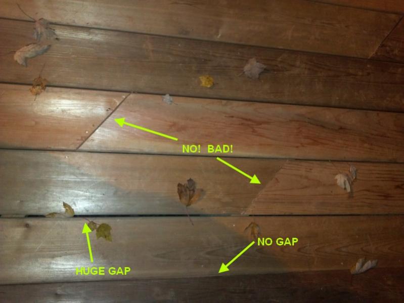 He just paid no attention to what had been done, and very little to what he was doing.... Attachment 35225 I use a nail to keep the expansion gap the same everywhere. I just put the nail between the board I'm nailing and it's neighbor to keep them parallel. Boards have crowns... sometimes you have to bend them a little to make it work.... Attachment 35224 Attachment 35226 |