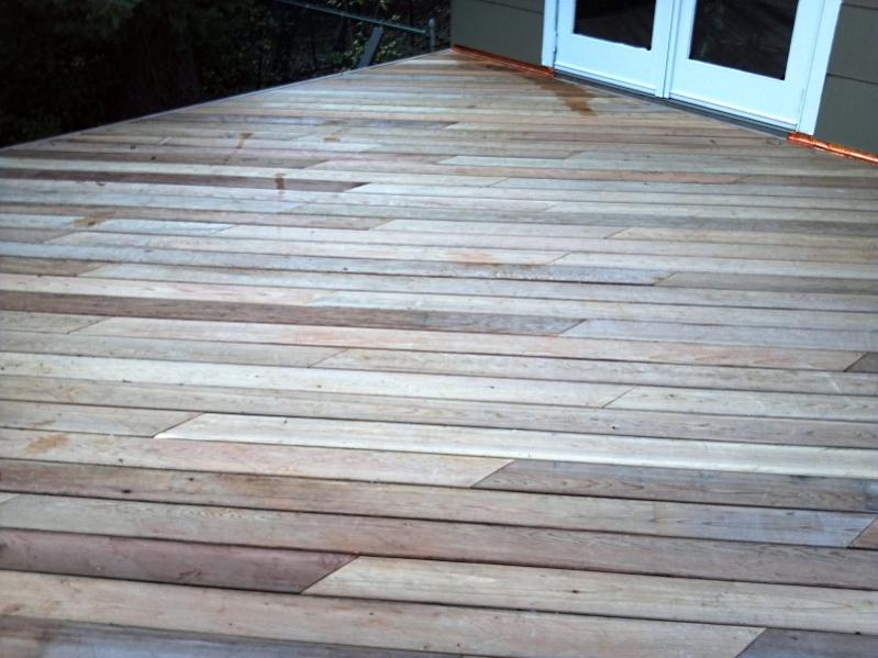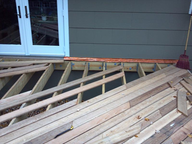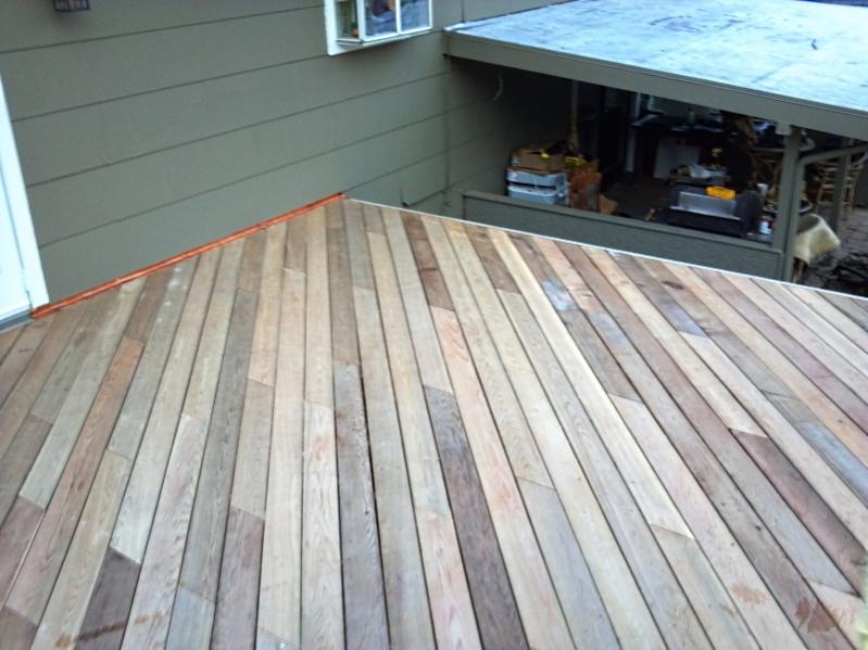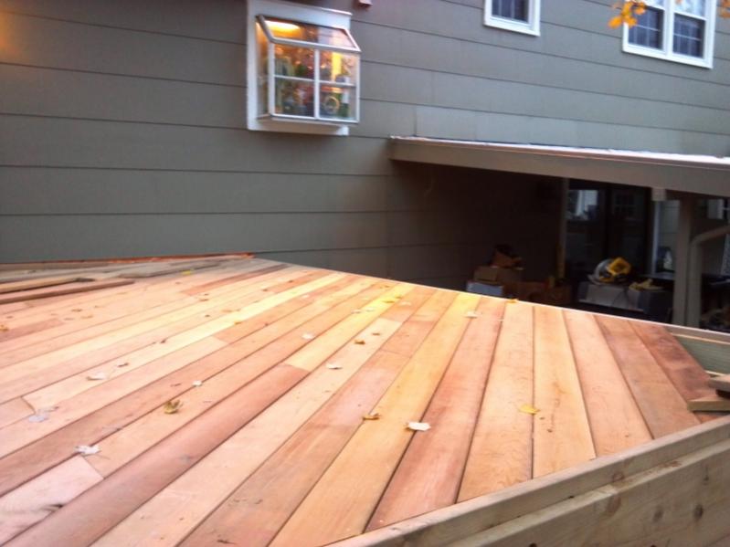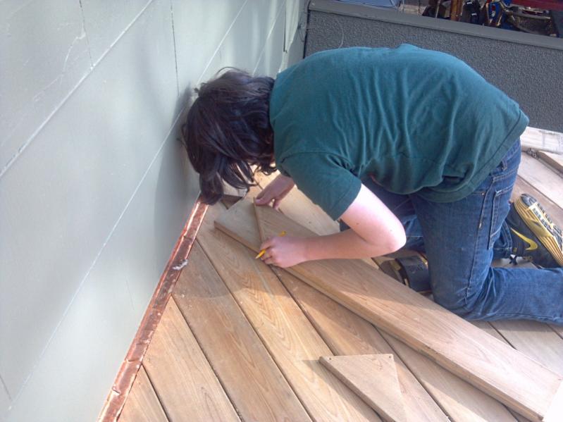 Attachment 35444 He took charge of striking the lines for cuts. We had to use a template on the side where it butts up against the house, because you can't hang past the edge and eyball it like the other 3 sides. Attachment 35445 Attachment 35446 Here's the angle that all of the boards that meet that copper flashing have Attachment 35447 |