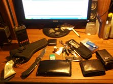 Wallet, key, safety pin, bottle/can opener, little pocket knife, bigger pocket knife w/clip, cell phone, lighter, camera, and a hankie (no, not Mr. Hanky).